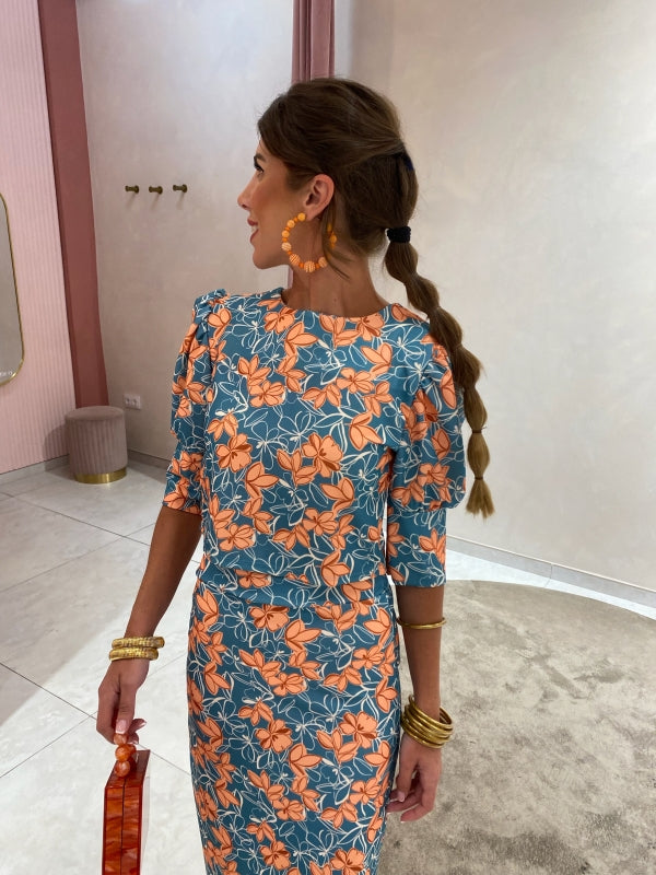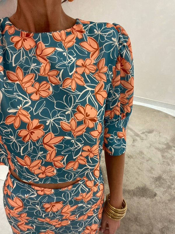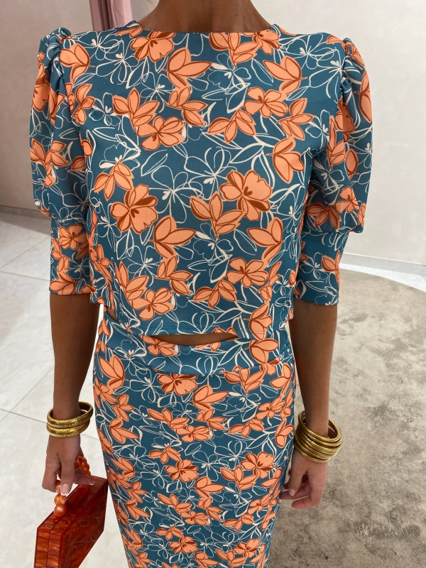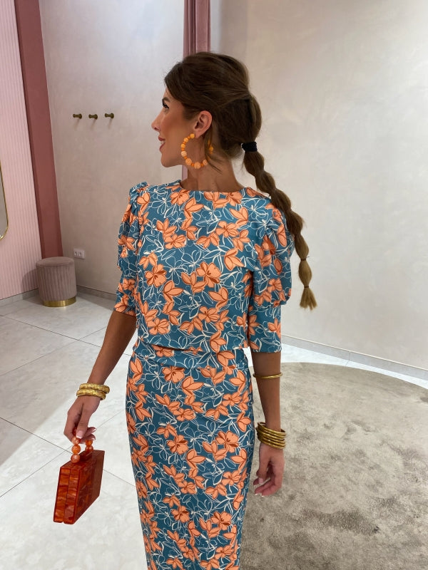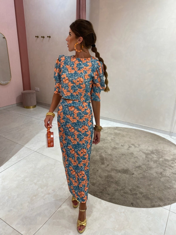 Alix set, a sophisticated combination of half sleeve top and straight skirt, both with a vibrant floral print in shades of aqua green and orange.