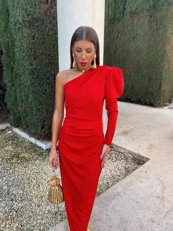 This asymmetric dress with a puffed sleeve with invisible side zipper and side gathering at the waist is an elegant and simple model perfect for weddings, baptisms, elegant dinners...