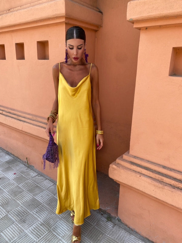 Crafted from a satin fabric that flows gracefully around the silhouette, its sheen catches the light with every movement, evoking the delicacy of silk. The design of this dress is distinguished by a flattering neckline that elegantly cascades, adding a touch of sensuality and organic movement.