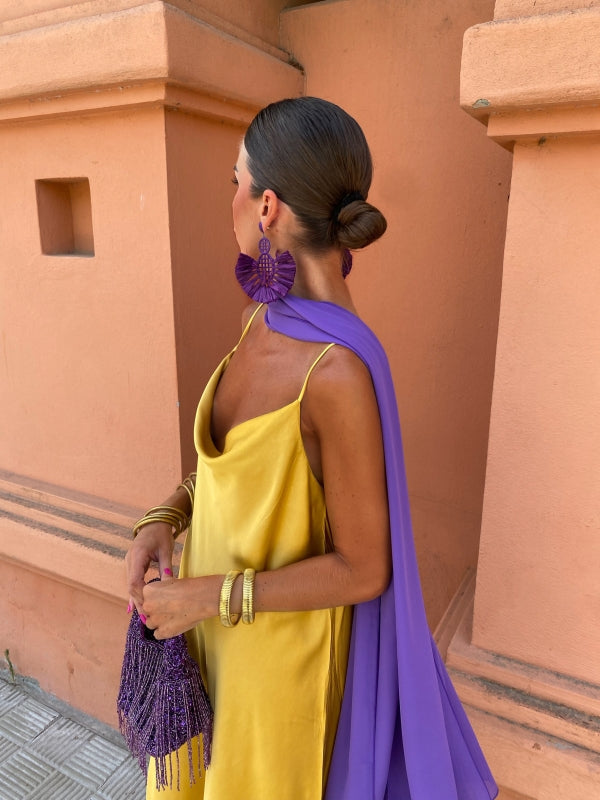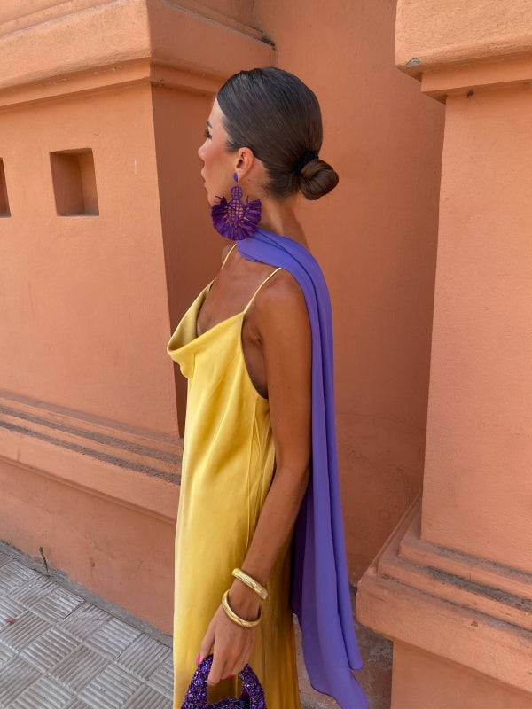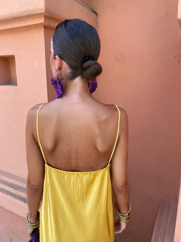 Its delicate thin straps gracefully accentuate the shoulders, while the dress's cut floats lightly, gently adapting to the body without constricting. The exceptional comfort and impeccable drape make it the perfect choice for an unforgettable event where color will take center stage.