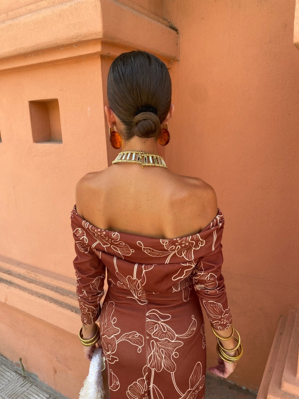 This long guest dress in a vibrant brown tone is the perfect choice for those seeking a captivating and flowing look. The design of the dress focuses on its off-the-shoulder neckline, which ties delicately at the center of the neckline and leaves the back exposed. The front features a deep V-neckline that is accentuated by gathering or draping that defines the waist.