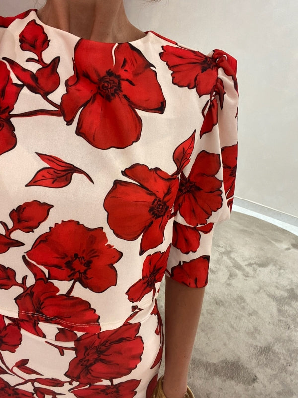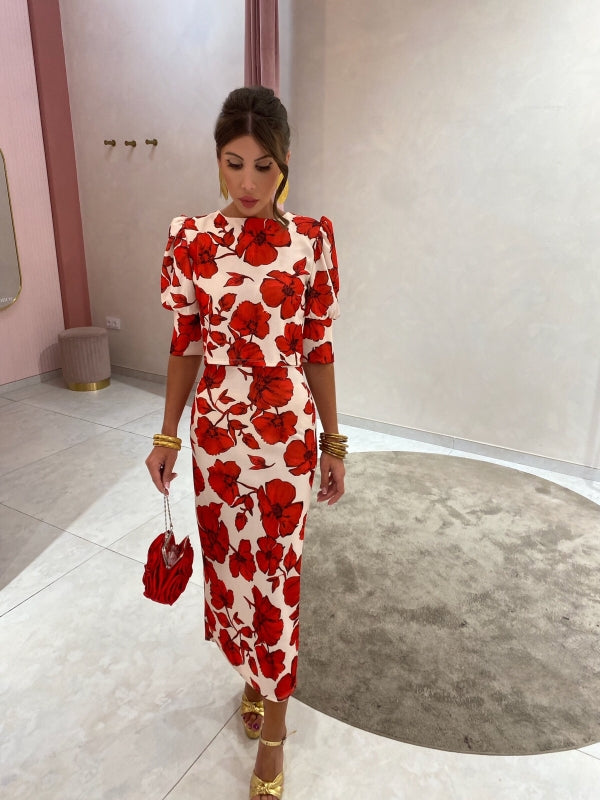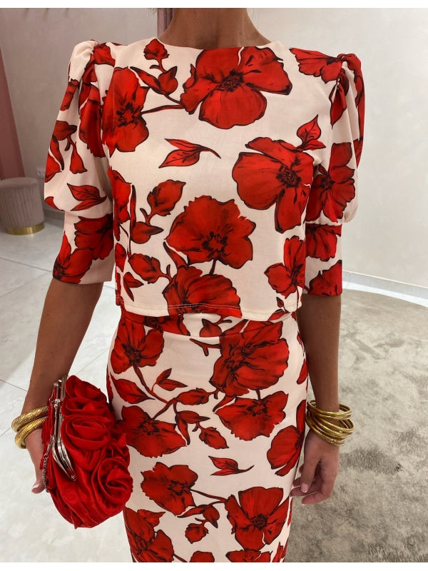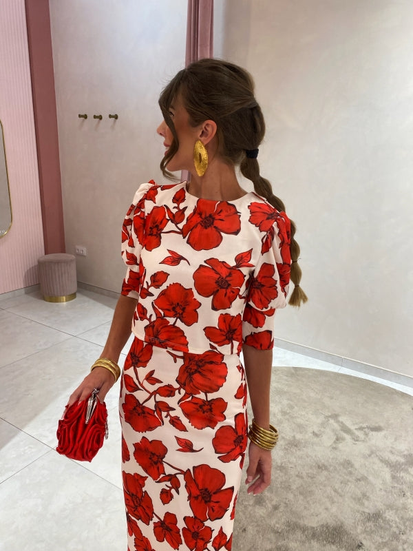 Fall in love with the Lola Set, a charming combination of a half-sleeve top and straight skirt, both featuring a delicate red floral print on an elegant cream background.