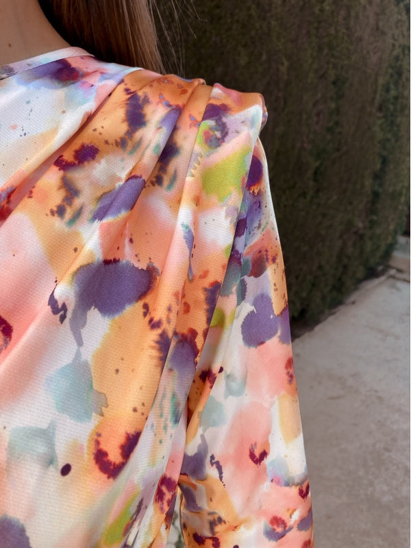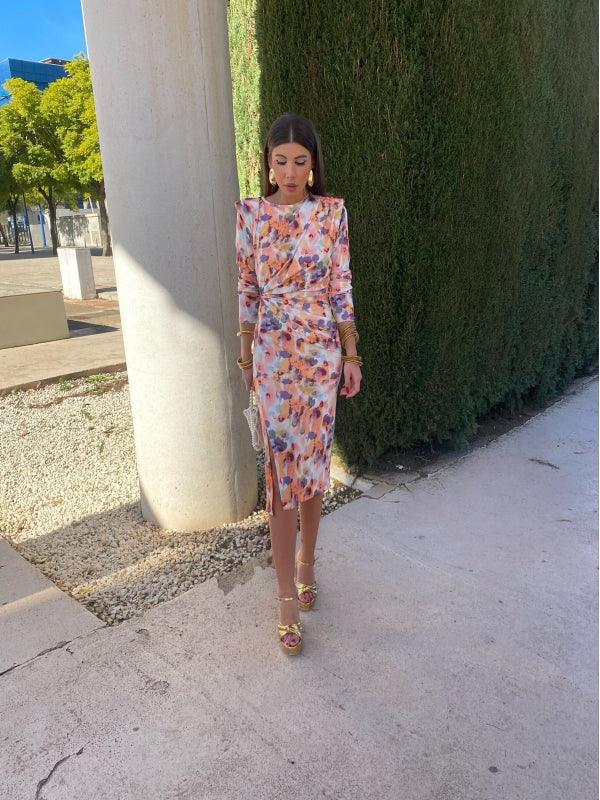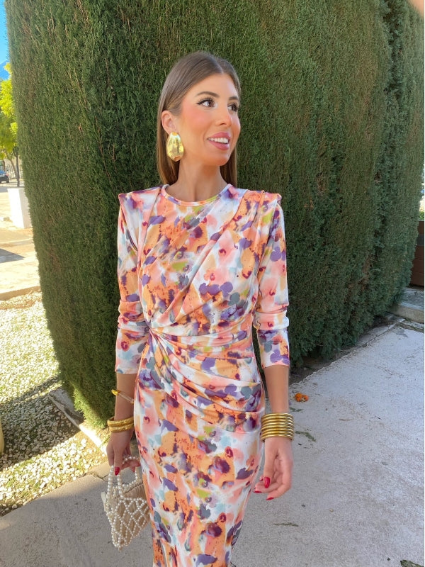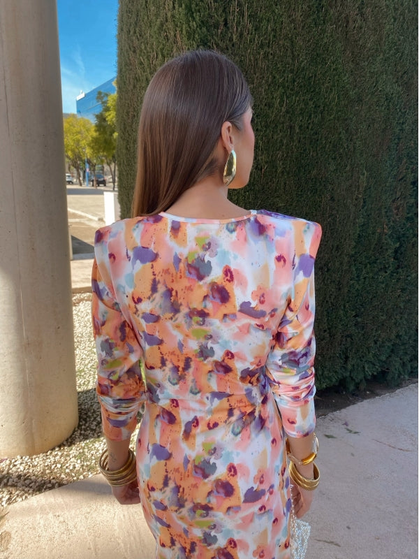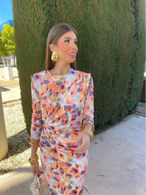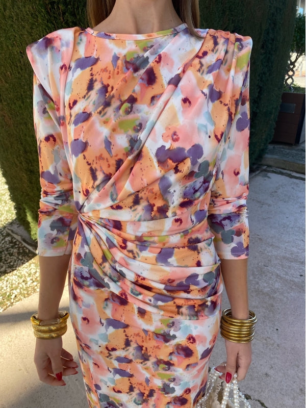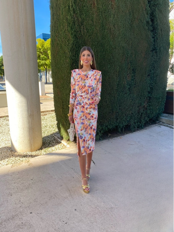 Its shoulder pads and front gathering enhance the figure. This original printed dress with colorful spots will become your favorite choice for your spring events. It can be a perfect dress for business dinners, family meals, wedding guests, baptisms, communions...
