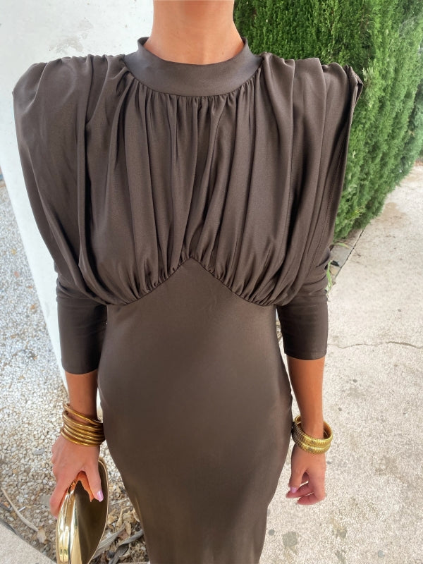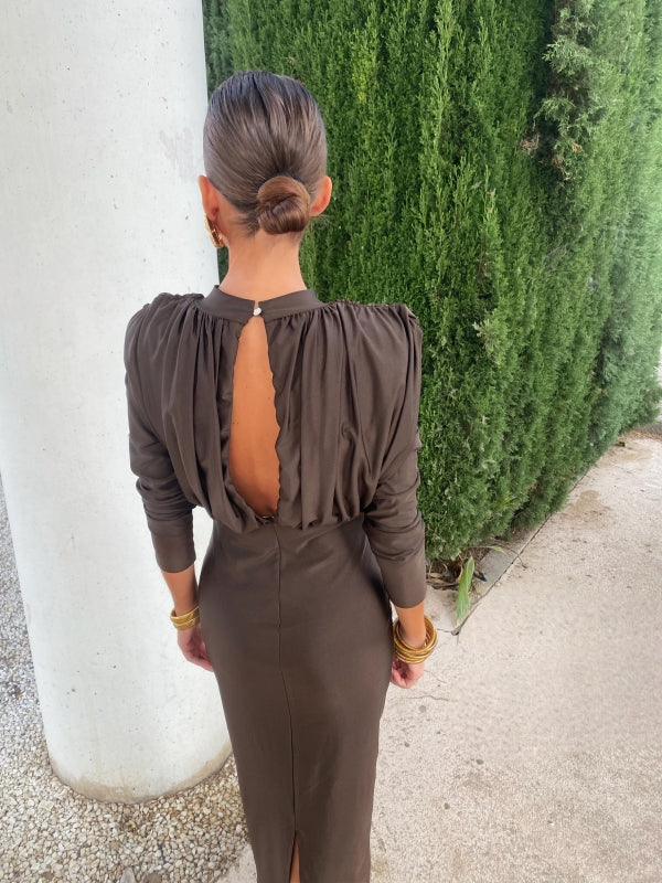 Its long sleeves and structured shoulders design acquires a more natural and sophisticated air in this color, while the opening in the back keeps the sensual touch. The main attraction of this guest dress is its innovative neckline, designed with a flattering draping that enhances the silhouette.