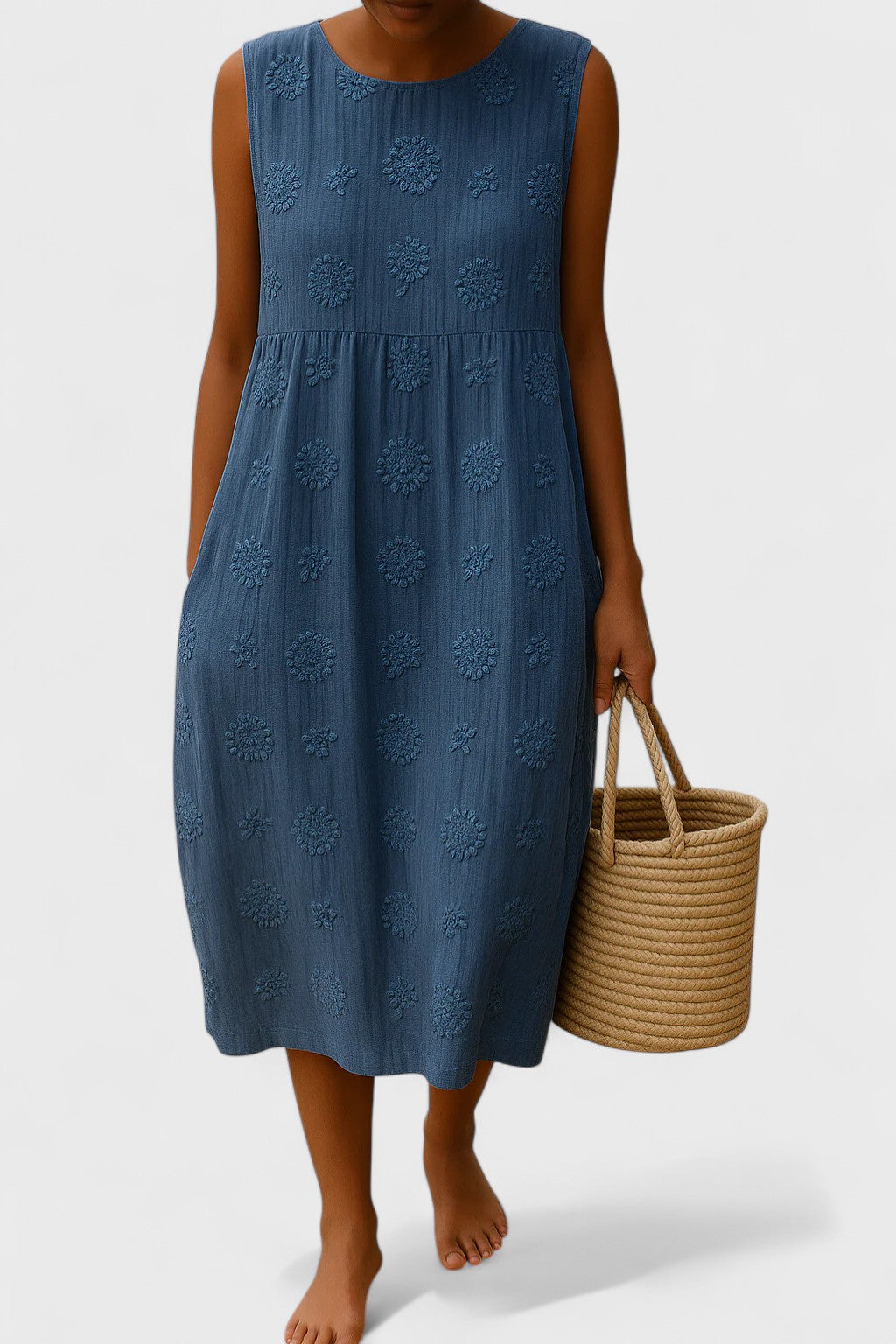 The Elena dress blends elegance with everyday comfort. Made from a high-quality linen-cotton blend, it’s light, breathable, and perfect for warm spring and summer days. A cheerful floral print and delicate embroidery details add a touch of timeless charm. With a flattering gathered waist, practical side pockets, and a versatile midi length, this sleeveless dress is your go-to for effortless style—whether at home, on vacation, or out for a stroll.