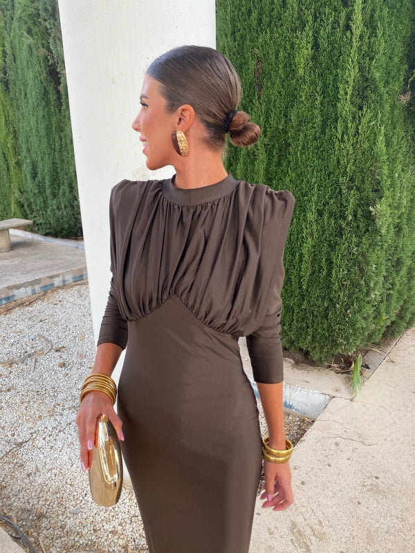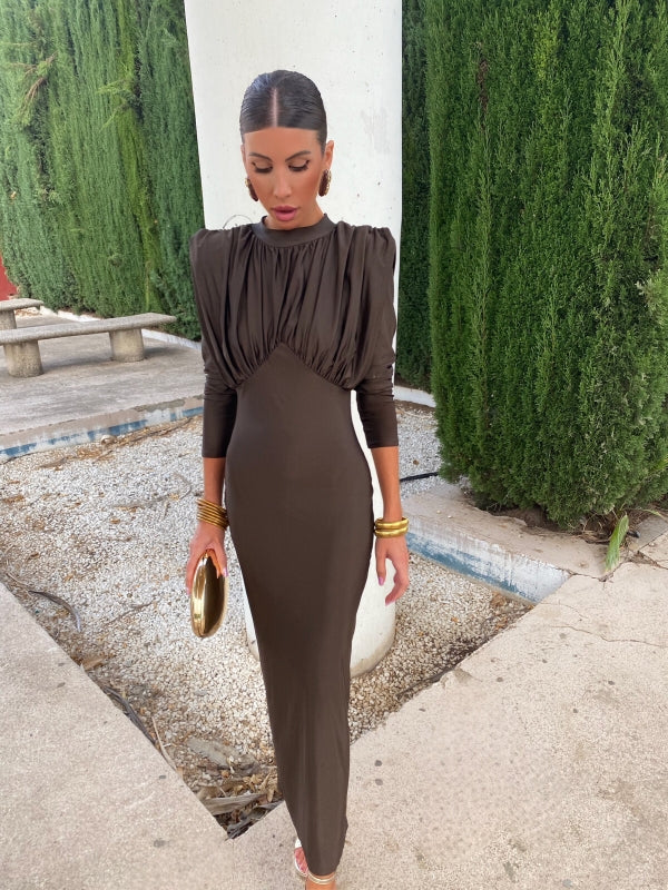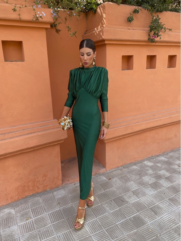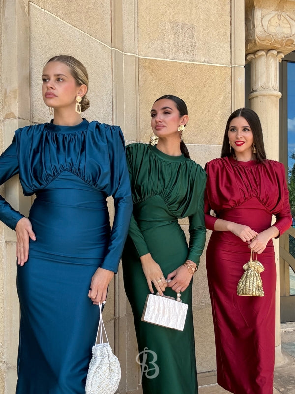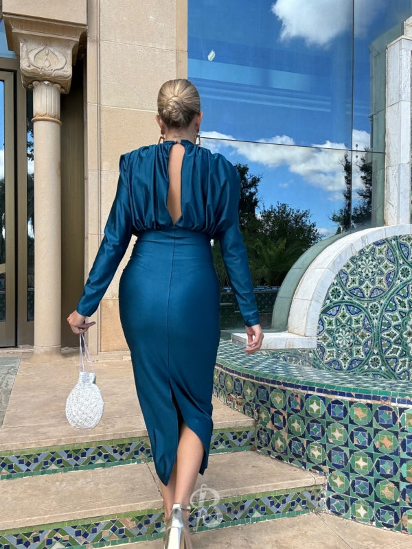 With its sleek satin finish, flattering fit, and chic back slit, this dress blends timeless style with modern sophistication. The long sleeves and structured shoulders add just the right amount of drama, while keeping you comfortable all night long.