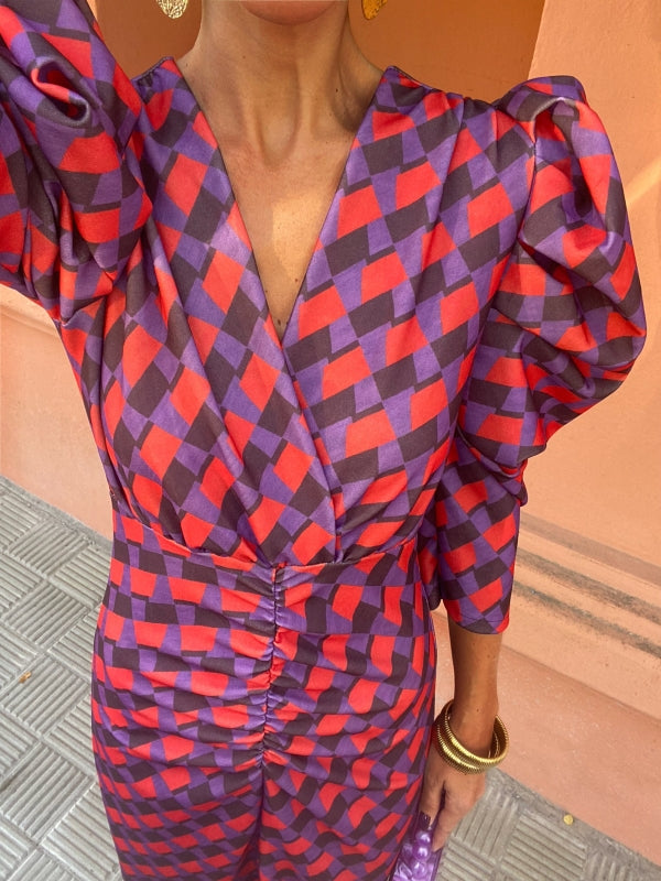 Crafted in a drapey crepe fabric , the dress is distinguished by its captivating geometric diamond print in the vibrant combination of Purple, Purple and Pink/Fuchsia. The design features a flattering crossover V-neckline at the bust and a midi length that falls elegantly below the knee.